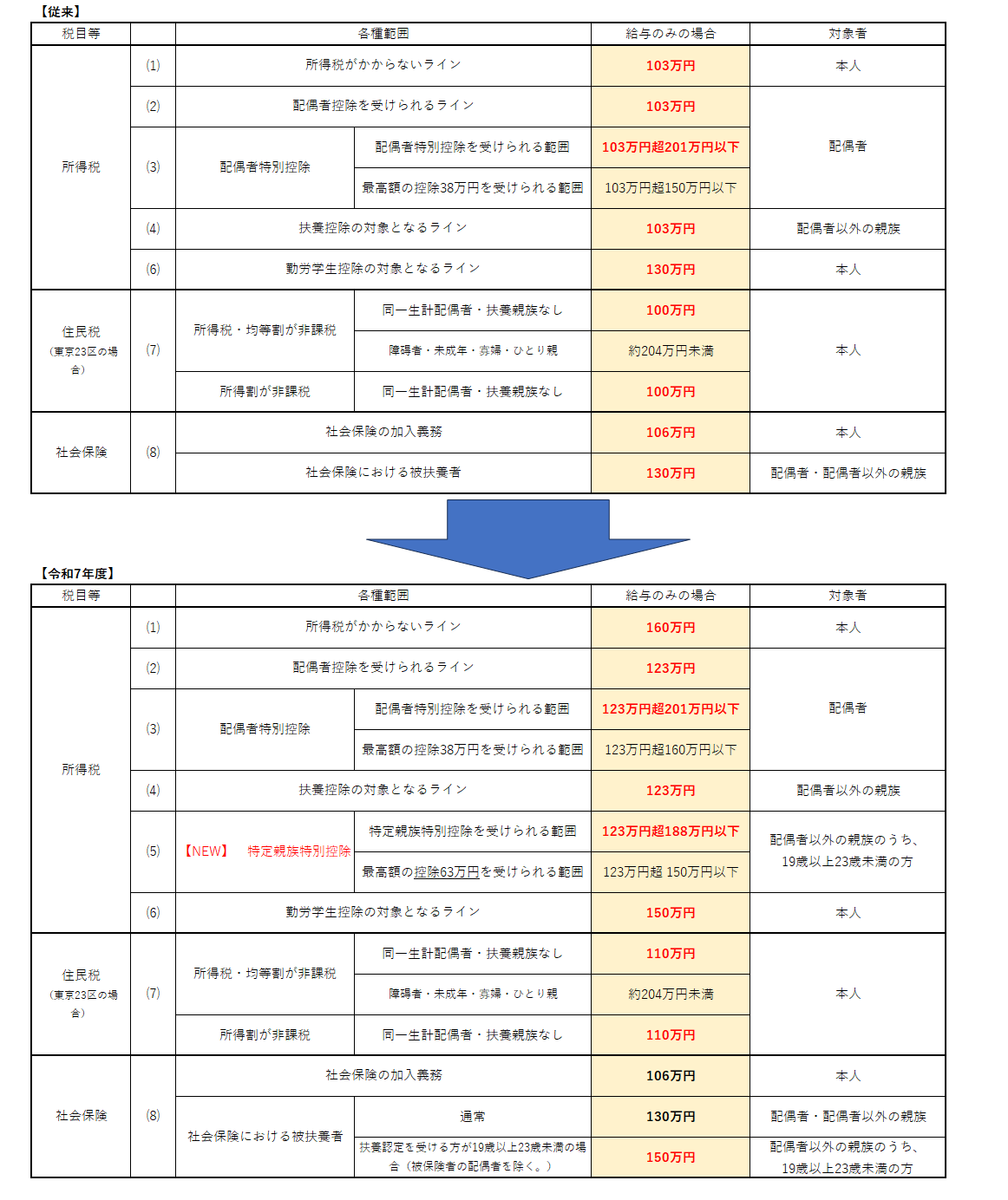 年収の壁の視点から、従来との変更点を所得税・住民税・社会保険の種類別にまとめると、下記の通りとなります。