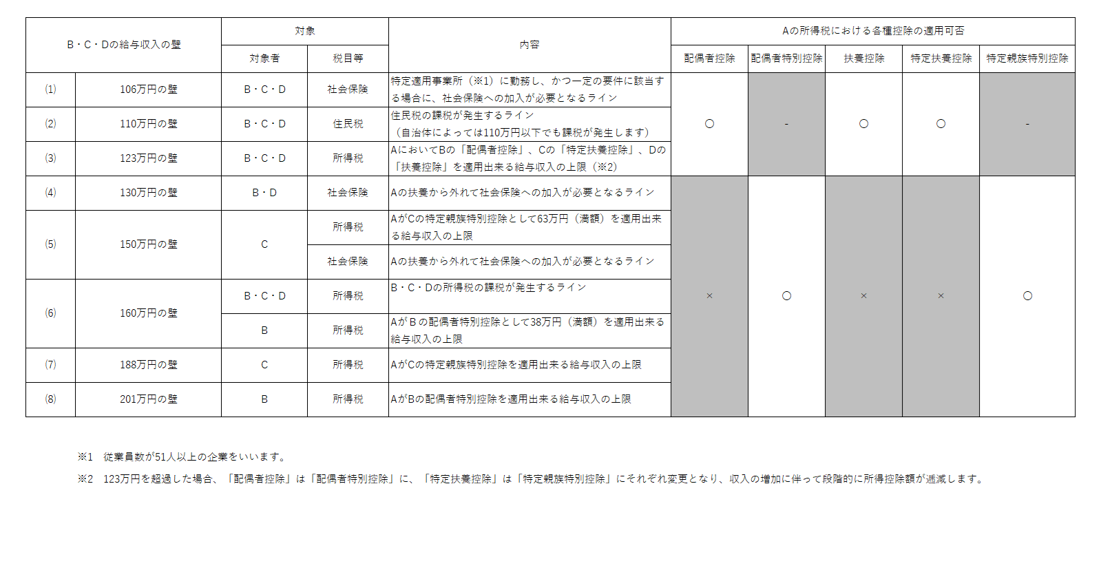 ⑴の106万円の壁に該当しなかった場合でも、B・Dの給与収入が130万円以上になると、Aの社会保険の扶養から外れ、自ら社会保険料を負担する必要があります。